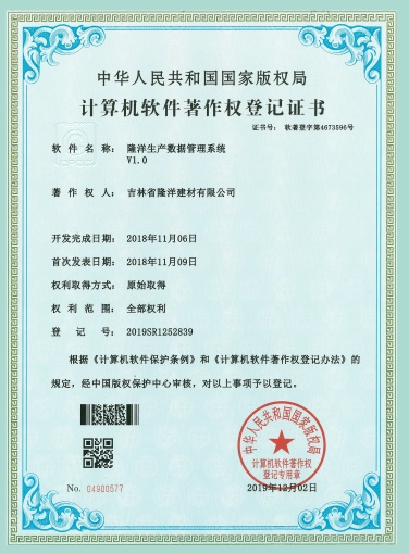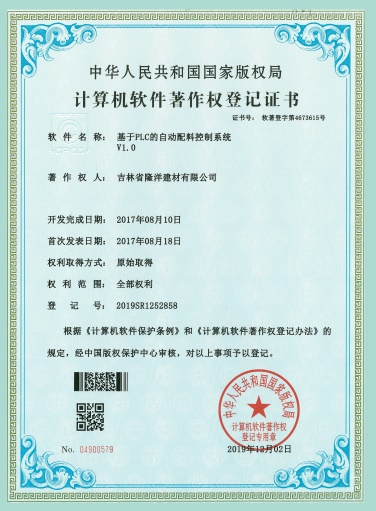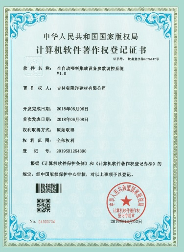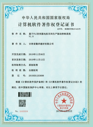 自2017年~2019年隆洋公司連續(xù)三年【榮獲裝配式墻板全自動(dòng)化生產(chǎn)計(jì)算機(jī)軟件九項(xiàng)著作權(quán):證書號(hào);第4673615號(hào);第4674524號(hào);第4673596號(hào);第4673587號(hào);第4673606號(hào);第4675147號(hào);第4673380號(hào);第4674455號(hào);第4673635號(hào);】,