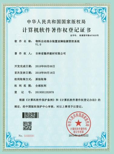 是吉林省隆洋建材有限公司生態(tài)安全與科技創(chuàng)新 “發(fā)明專利”;發(fā)明專利號(hào):ZL 2019 2 0158616.X。