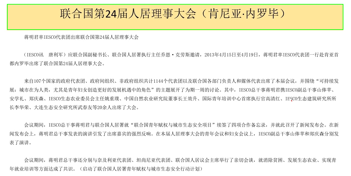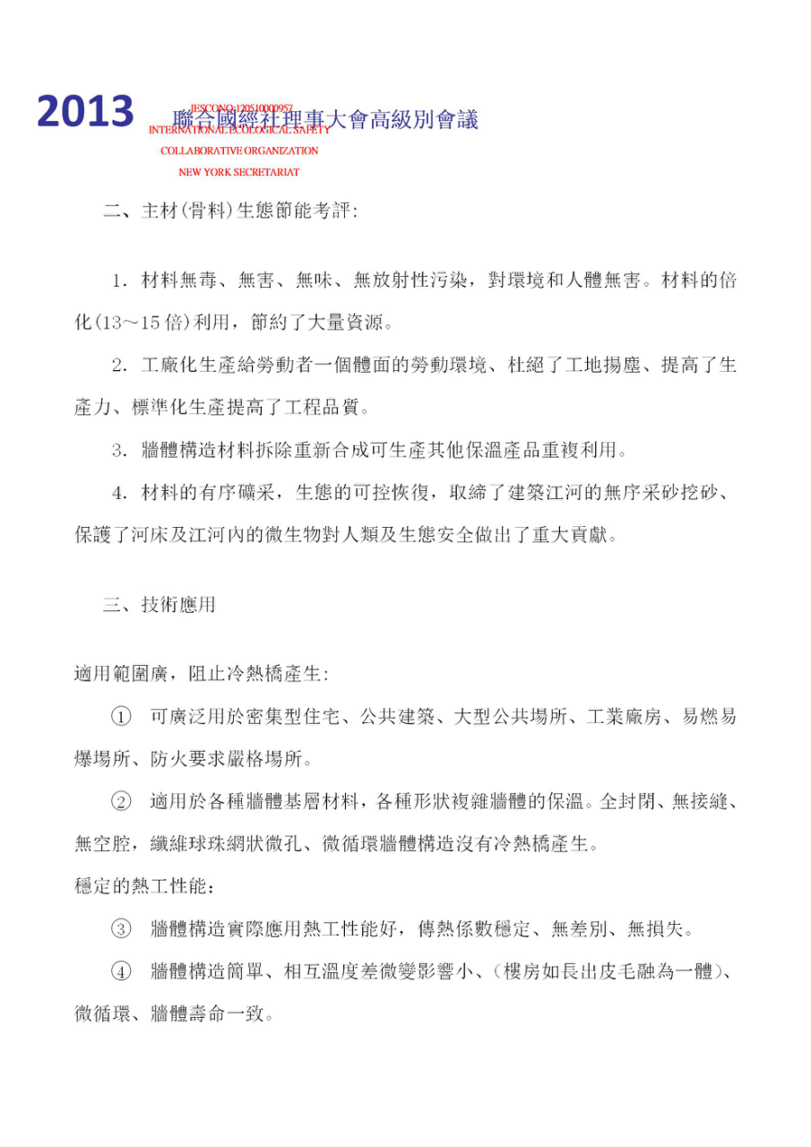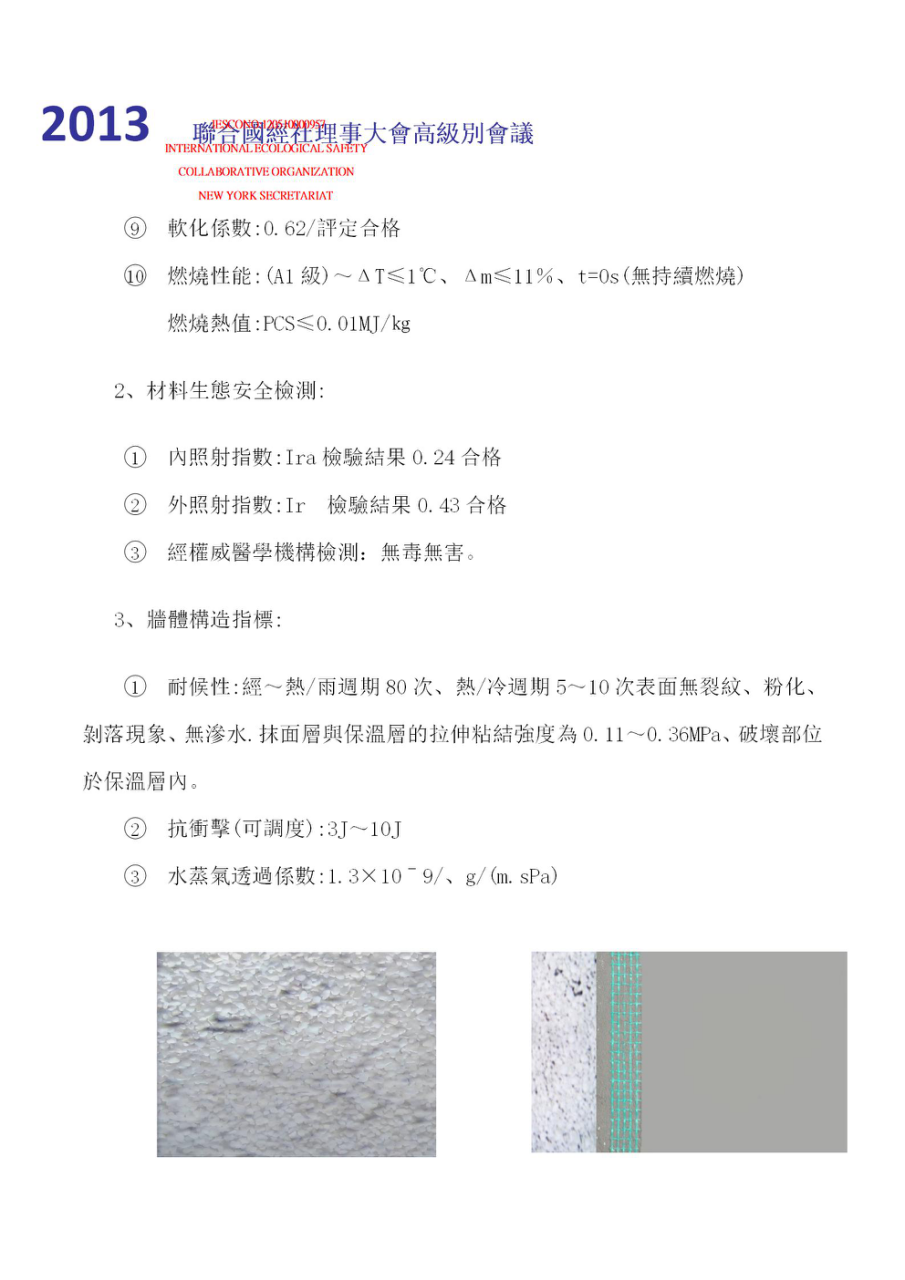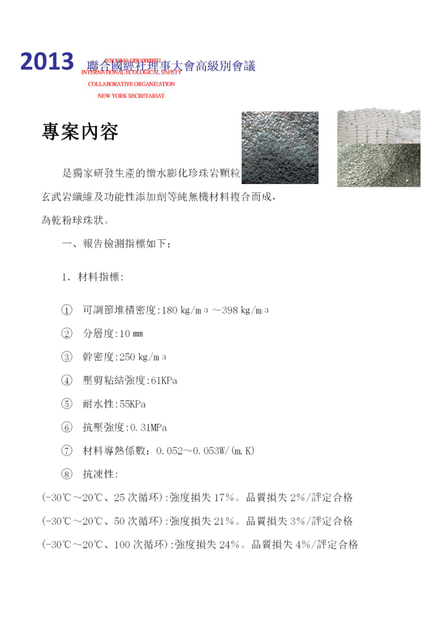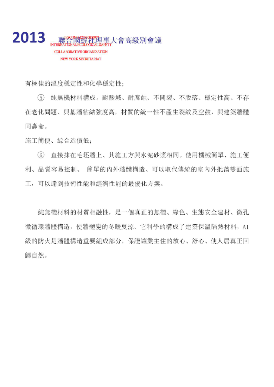 2013年4月參加聯(lián)合國(guó)人居署理事大會(huì)第24屆會(huì)議在內(nèi)羅畢召開——倡導(dǎo)并呼吁人居建筑生態(tài)安全。 同年7月聯(lián)合國(guó)經(jīng)社理事會(huì)高級(jí)別會(huì)議——《生態(tài)安全與科技創(chuàng)新專題會(huì)議》瑞士.日內(nèi)瓦,聯(lián)合國(guó)經(jīng)社理事大會(huì)高級(jí)別會(huì)議——產(chǎn)品獲人居建筑材料《生態(tài)安全與科學(xué)技術(shù)創(chuàng)新》鑒定。 同年9月參加2013歐亞經(jīng)濟(jì)論壇——中國(guó).西安;再次倡導(dǎo)并呼吁人居建筑生態(tài)安全。