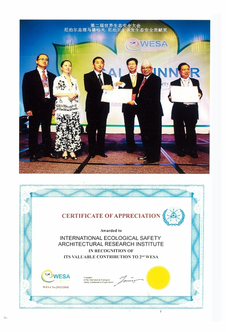 2012年參加第二屆世界生態(tài)安全大會(huì)印尼.巴厘島召開——榮獲人居建筑《生態(tài)安全貢獻(xiàn)獎(jiǎng)》——由尼泊爾王國(guó)前總理馬德哈夫.庫(kù)瑪.尼泊爾頒發(fā)。