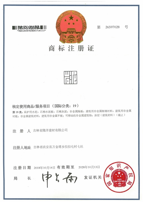 是吉林省隆洋建材有限公司生態(tài)安全與科技創(chuàng)新 “發(fā)明專利”;發(fā)明專利號(hào):ZL 2017 1 0759585.9。